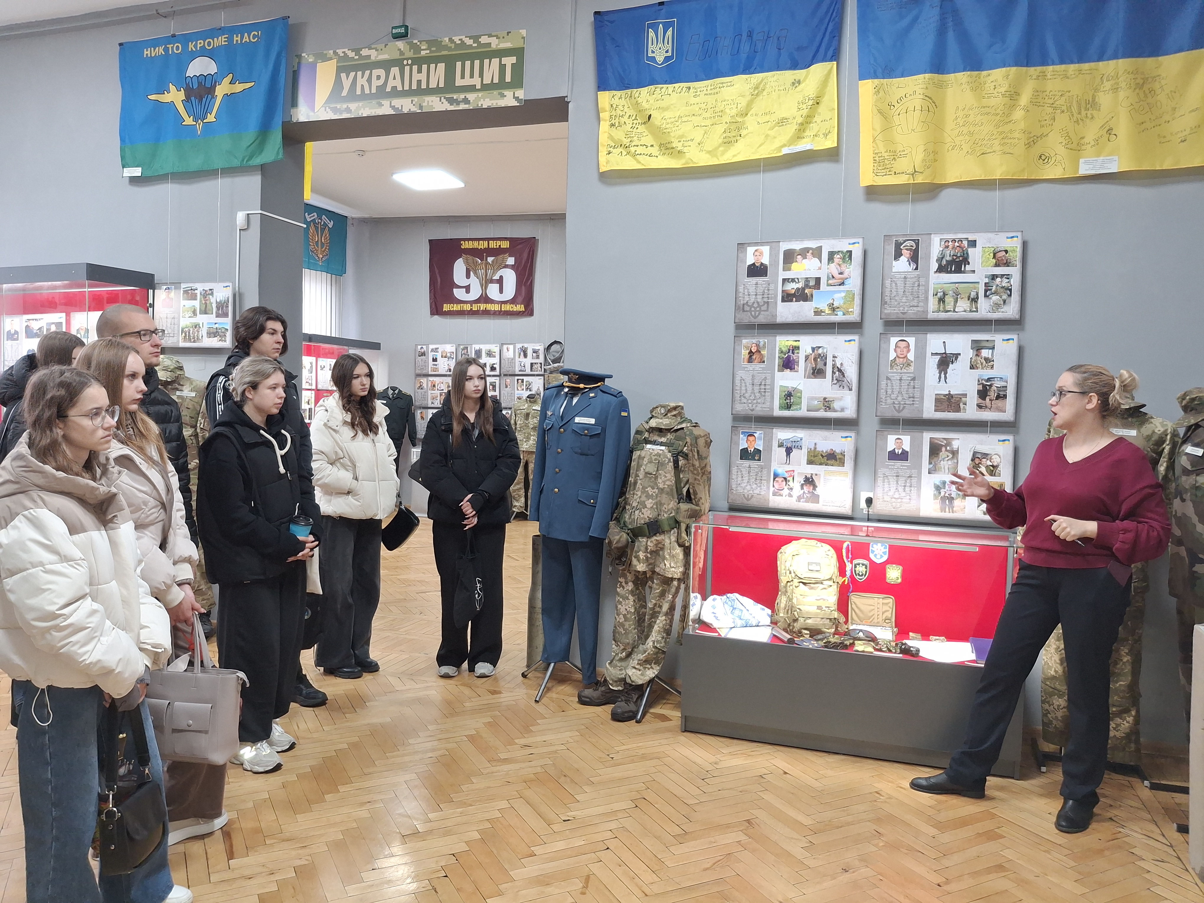 У виставкових залах здобувачі вищої освіти мали можливість оглянути особисті речі, світлини, документи, військову форму та спорядження Героїв Небесної Сотні та полеглих воїнів російсько-української війни.